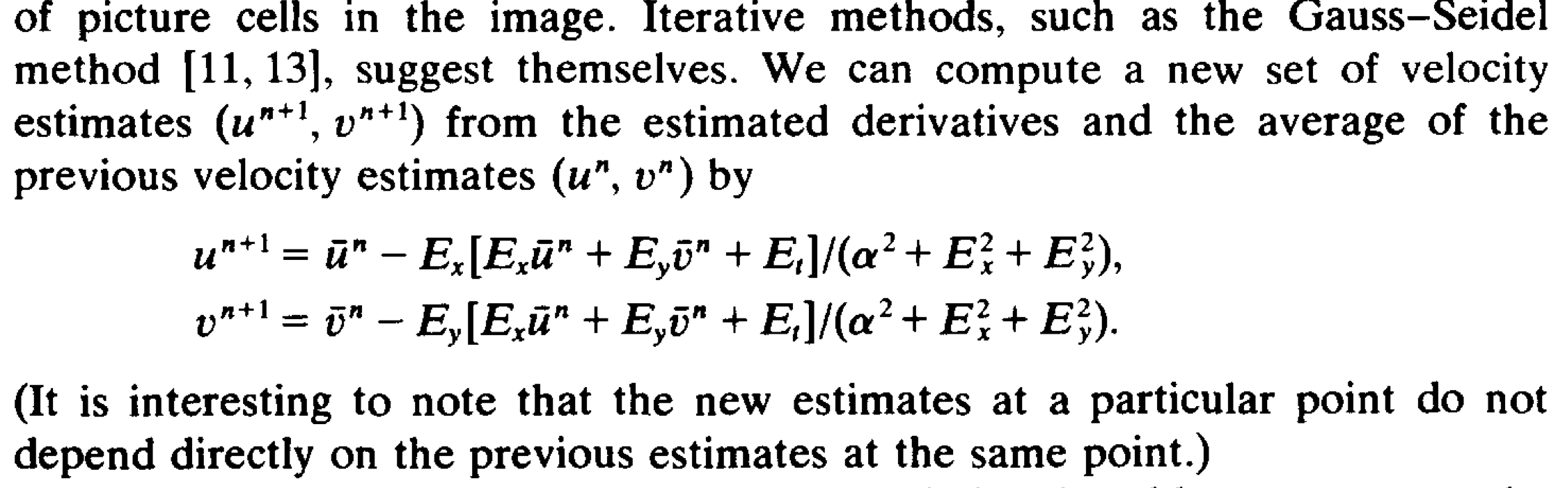 The paper ends up using an iterative solution to solve the equations posed above. It seems like iteration is key to pretty much all optical flow(? or beyond) methods. There is also some choices one can make when it comes to the particular way iteration is performed: