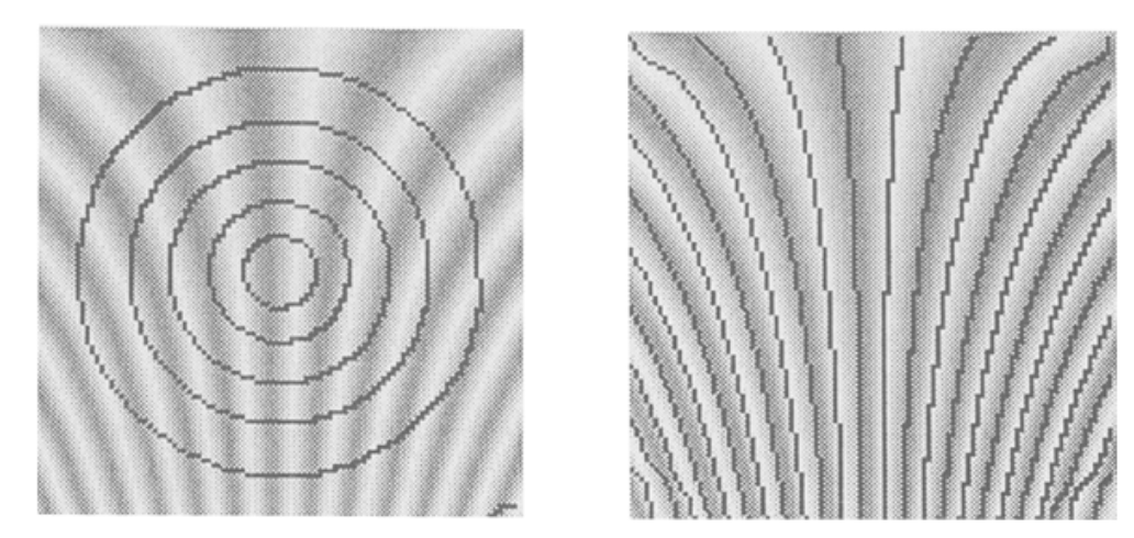 Left: contours of equal amplitude. Right: contours of equal phase.